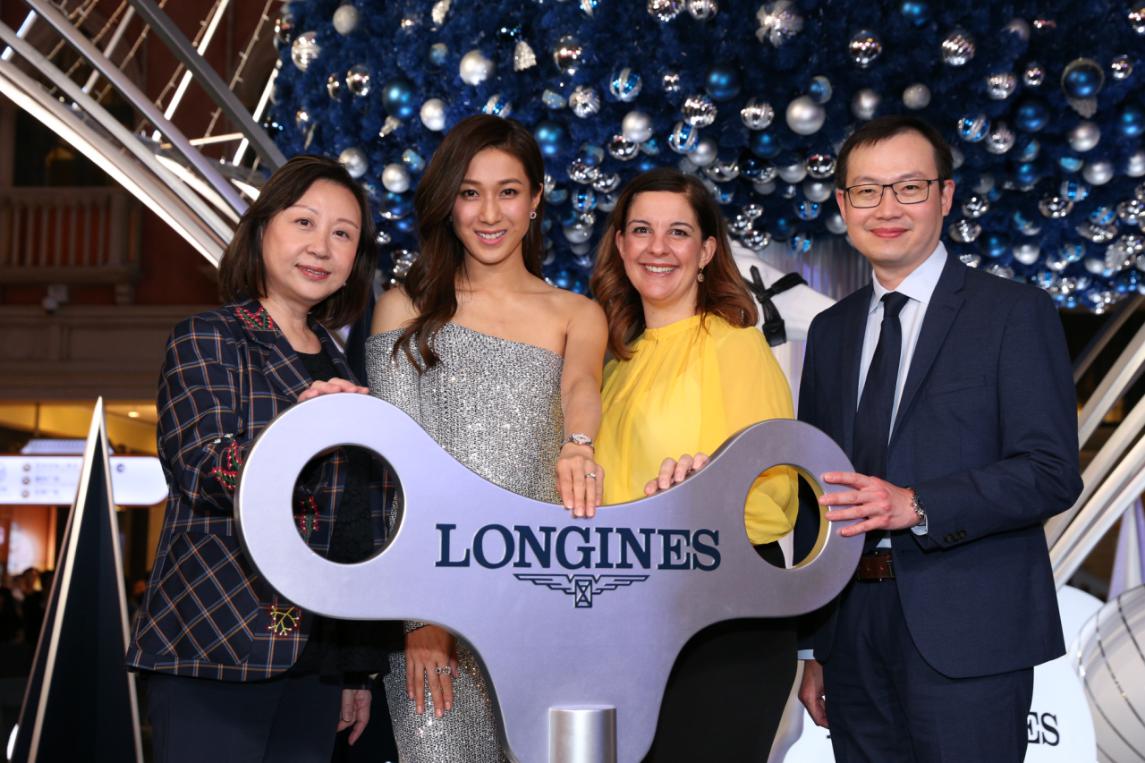 (左起)浪琴澳門副總裁鄭美齡、影視明星鐘嘉欣、金沙中國有限公司零售市場推廣副總裁Rita Simonetta及金沙中國有限公司商場管理部總監(jiān)梁俊強一同啟動高達(dá)13米的藍(lán)色菱形圣誕樹底部的音樂盒裝置。