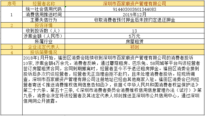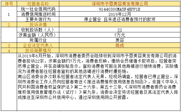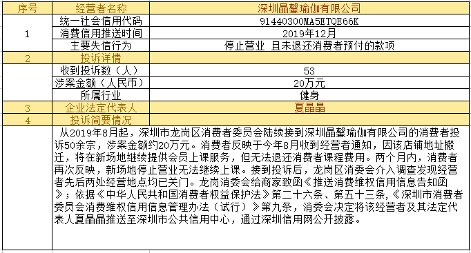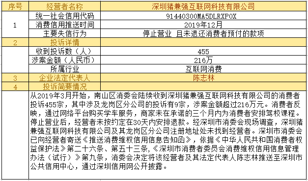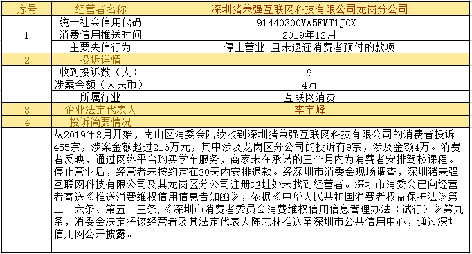 深圳新聞網(wǎng)2019年12月24日訊12月24日,為加強對商品和服務的社會監(jiān)督,推進消費領(lǐng)域信用體系建設,深圳市消費者委員會(以下簡稱“深圳市消委會”)聯(lián)合福田區(qū)消費者委員會(以下簡稱“福田區(qū)消委會”)和龍崗區(qū)消費者委員會(以下簡稱“龍崗區(qū)消委會”)將深圳豬兼強互聯(lián)網(wǎng)科技有限公司、深圳市皇域貿(mào)易有限公司、深圳市百家順資產(chǎn)管理有限公司、深圳市予恩美容美發(fā)有限公司、深圳晶馨瑜伽有限公司等五家預付式和互聯(lián)網(wǎng)消費領(lǐng)域停止營業(yè)且未退還消費者預付款項的經(jīng)營者及其主要負責人推送至深圳市公共信用中心,通過深圳信用網(wǎng)公開披露。