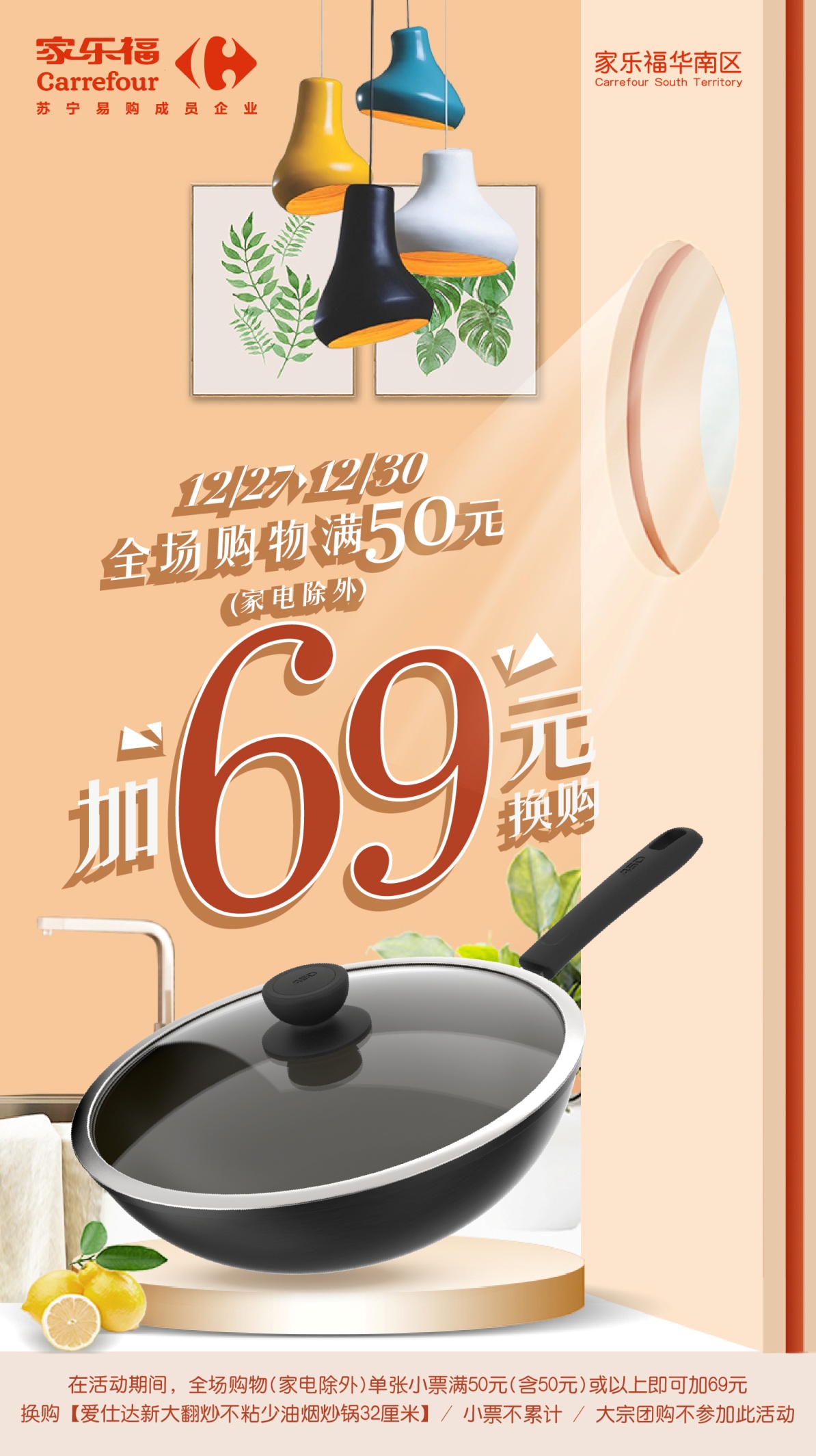 最后播報(bào)一則“筍盤”信息。12月27日至30日,顧客在家樂福華南區(qū)門店全場(chǎng)購(gòu)物滿50元,還可加69元換購(gòu)愛仕達(dá)新大翻炒不粘少油煙炒鍋32厘米(家電、大宗團(tuán)購(gòu)除外,小票不累計(jì))。