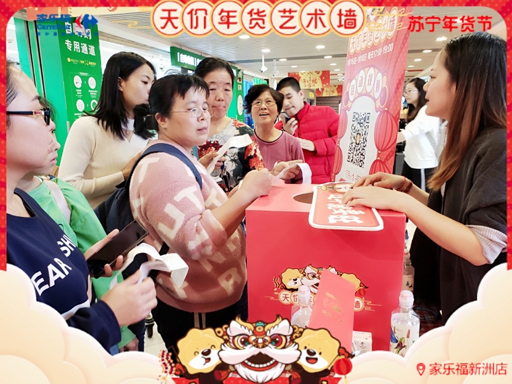 天價年貨藝術(shù)墻,藝術(shù)年貨送不停 ! 1月17日 至 1月 19 日 , 家樂福華南區(qū)廣州員村店、珠海吉大店、福州寶龍店 、廈門中華城店及 深圳新洲店 (活動時間為1.16-1.18) 活動繼續(xù) 。 禮品數(shù)量有限,每天送完即止 !蘇寧家樂福 實力助你過年味滿滿的春節(jié) ,邀請您 來把年貨驚喜領(lǐng)回家 !