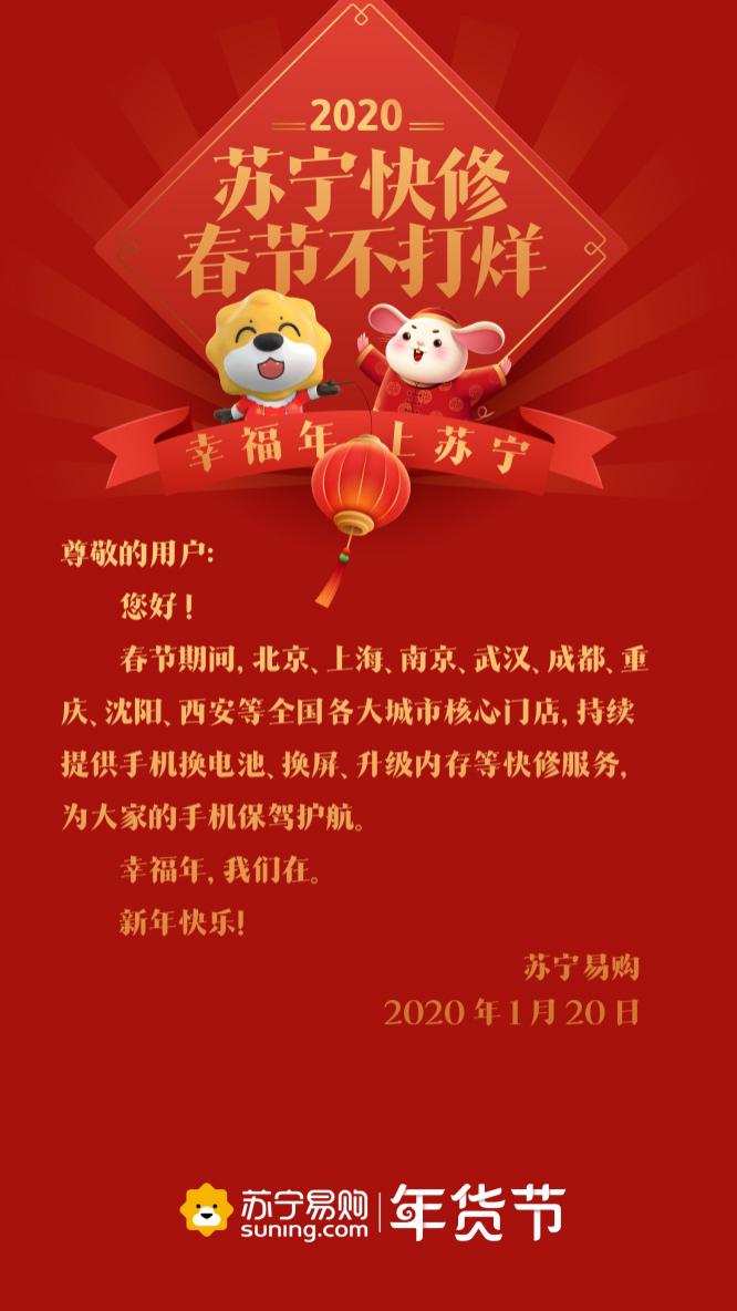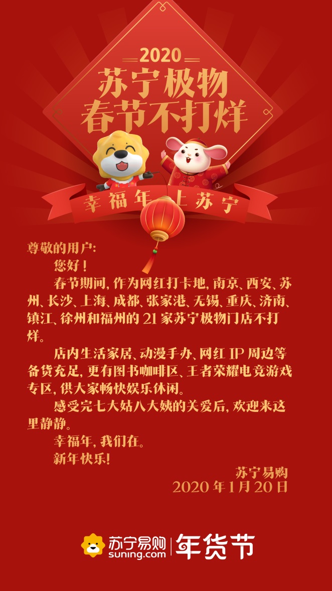 深圳新聞網(wǎng)2020年1月21日訊 春節(jié)臨近,忙著打烊成為了商家常態(tài)。有意思的是,1月20日,蘇寧連發(fā)9條通知,廣而告之“不打烊”。通知顯示,物流、蘇寧幫客、蘇寧快修、以舊換新等服務(wù)內(nèi)容,電器店、家樂(lè)福、零售云、紅孩子門(mén)店、極物等線(xiàn)下業(yè)態(tài)都確保不打烊、不漲價(jià)。