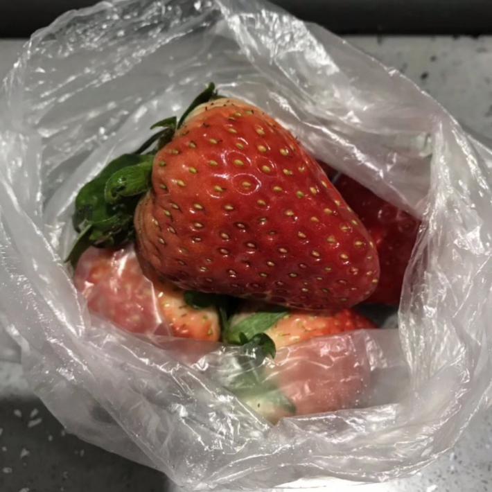 這些天,讓林濤印象最深刻的,是有一天一位老奶奶,也是他的老顧客,用保鮮袋裝了好幾個又大又紅的草莓,戴著口罩特地來到店里送給林濤?!皳?jù)說那個草莓特別貴,她自己可能也不舍得吃?!绷譂敃r忍不住拍了照片保存下來:“就那種時候,你會感覺,留下來,值了!”