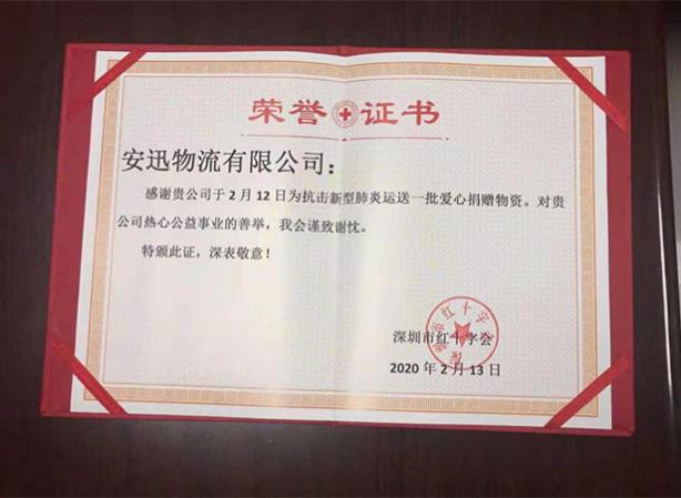 當(dāng)?shù)絻商幘柚攸c(diǎn)收集好物資后,國(guó)美物流車(chē)輛到達(dá)深圳市疾控中心已是下午兩點(diǎn)多,一路上兩人水米未進(jìn),盡力保證捐贈(zèng)物資的及時(shí)到位。深圳市紅十字會(huì)為國(guó)美安迅物流發(fā)來(lái)了榮譽(yù)證書(shū),對(duì)他們及時(shí)運(yùn)送愛(ài)心捐贈(zèng)物資的善舉表示感謝。
