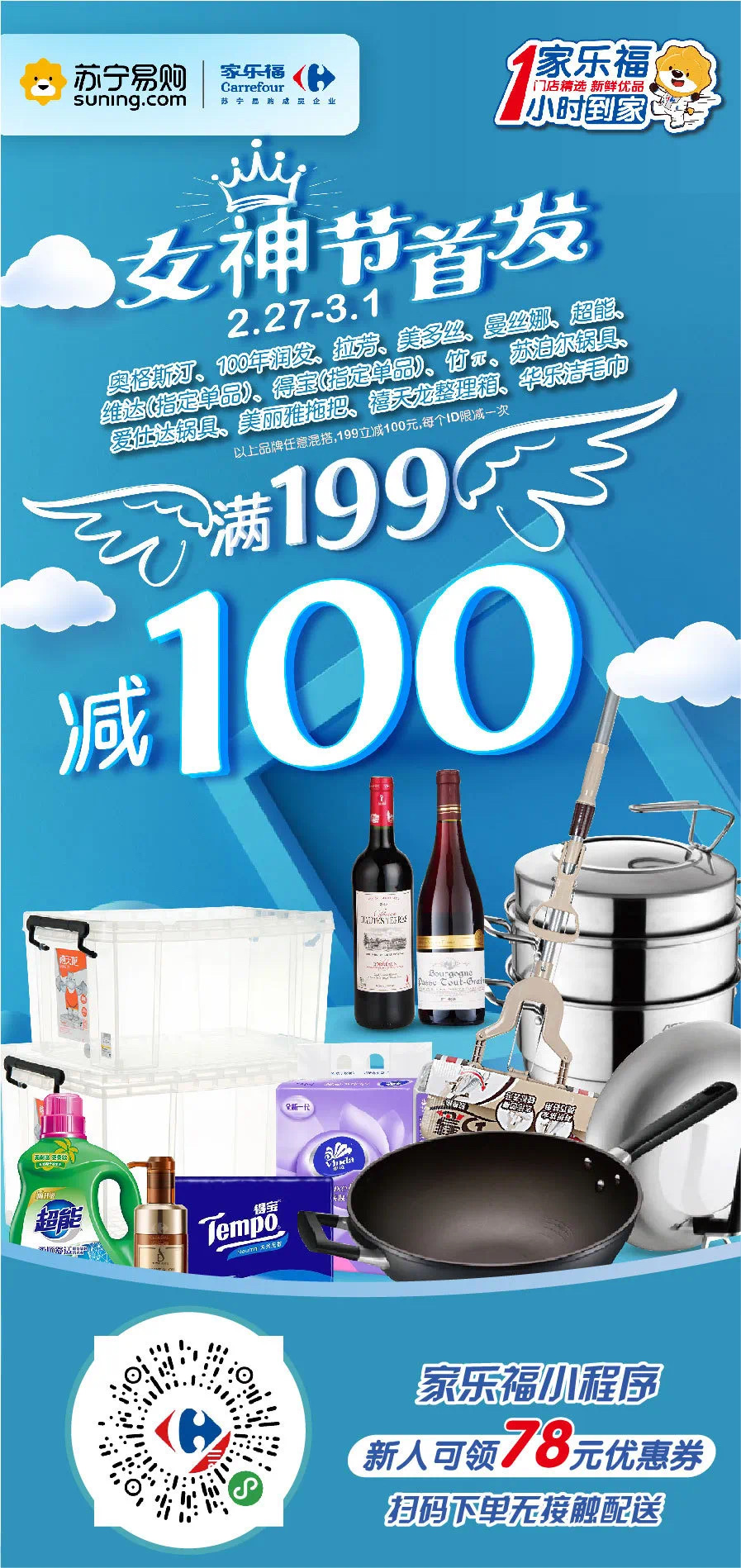 2月27日至3月1日,在家樂(lè)福小程序購(gòu)買(mǎi)奧格斯汀、100年潤(rùn)發(fā)、拉芳、美多絲、曼絲娜、超能、維達(dá)(指定單品)、得寶(指定單品)、蘇泊爾鍋具、愛(ài)仕達(dá)鍋具、美麗雅拖把等非食品類(lèi)指定品牌滿(mǎn)199立減100元。