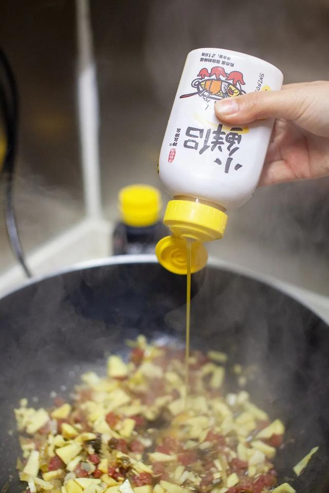 4.加入適量小鮮侶、醬油心生調味。臘腸、雪菜本身就會咸,不用再加鹽,食材炒熟即可出鍋。