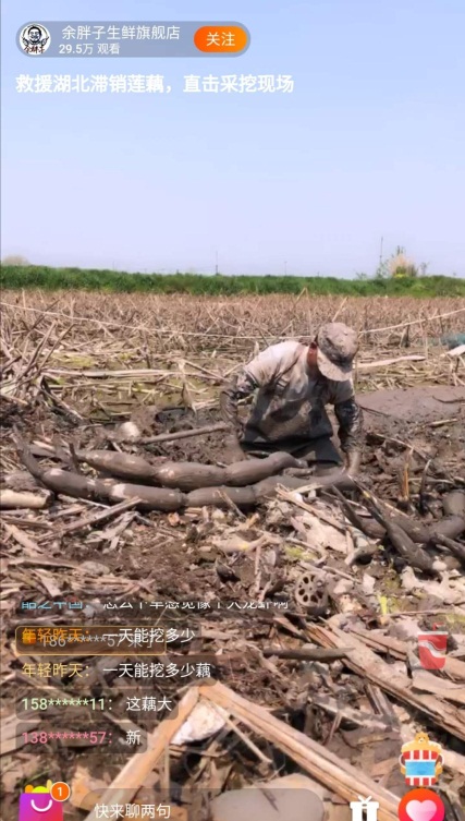 除了湖北的縣長(zhǎng)、市長(zhǎng)外,普通的湖北商戶不甘落后。8日上午,荊州洪湖的陽(yáng)光明媚,“余胖子生鮮旗艦店”的店主便打開手機(jī)接通了直播,樸實(shí)的農(nóng)民性格讓他面對(duì)鏡頭一時(shí)不知該說什么好,簡(jiǎn)單問好后,他就轉(zhuǎn)身下了塘,開始從厚重的泥土里拔出一根根新鮮的蓮藕。有不少00后網(wǎng)友是第一次見到挖藕的過程,他們發(fā)現(xiàn)原來潔白爽口的大藕居然是從泥中挖出來的,“挖藕真的太不容易了,一個(gè)上午要泡在塘泥里?!?/p>