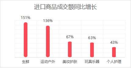 隨著人們生活水平的提升,進(jìn)口生鮮成交額同比增長(zhǎng)了151%。近幾年,進(jìn)口生鮮的價(jià)格門檻下降,尤其是進(jìn)口的奶制品、豬肉、牛肉的價(jià)格跟國(guó)產(chǎn)商品十分接近。此外,借助于品牌優(yōu)勢(shì),進(jìn)口的運(yùn)動(dòng)戶外、美妝護(hù)膚、玩具樂器、個(gè)人護(hù)理等商品的成交額同比增長(zhǎng)也比較高。