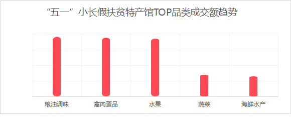 借助“五一”小長(zhǎng)假及線上消費(fèi)增長(zhǎng)的勢(shì)頭,各地的線上扶貧特產(chǎn)館成交額同比增長(zhǎng)了135%。各產(chǎn)地的糧油調(diào)味、禽肉蛋品、水果、蔬菜及海鮮水產(chǎn)等特產(chǎn)的成交額最高。