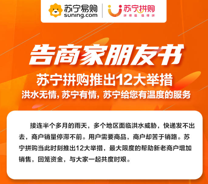 為了更好的幫助全國受汛情影響的農民搶銷農產品,蘇寧拼購發(fā)布了“戰(zhàn)汛十二條”的具體舉措,分為四大扶助方向: