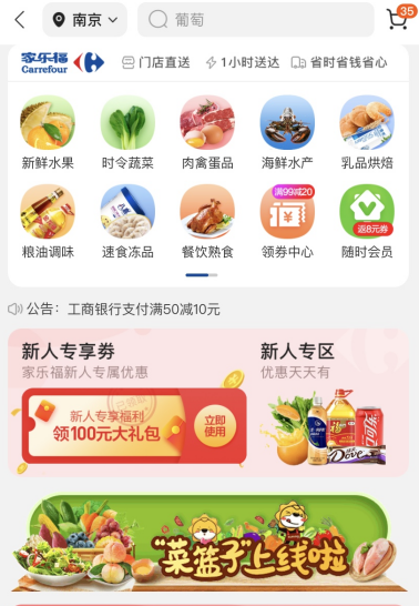自8月8日起,消費(fèi)者通過(guò)蘇寧易購(gòu) APP、家樂(lè)福微信小程序等平臺(tái),可以一鍵購(gòu)買米面糧油、乳品烘焙、水產(chǎn)肉類、蔬菜水果等食物,SKU超過(guò)700個(gè)。很快,菜籃子也將在蘇寧小店APP上線。門店三公里范圍內(nèi)的訂單,最快25分鐘便可送到家。目前,菜籃子已經(jīng)覆蓋了51座城市的215家家樂(lè)福門店。
