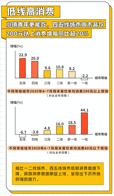 在周末消費(fèi)趨勢(shì)中,《2020周末餐飲堂食消費(fèi)趨勢(shì)洞察》還指出,相較于一二線城市,四五線等下沉市場(chǎng)高額消費(fèi)增速明顯上漲,200元以上消費(fèi)增幅超20%,顯示出強(qiáng)勁潛力。
