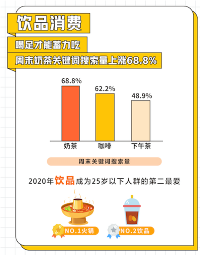 周末餐飲消費(fèi)中,在美團(tuán)點(diǎn)評(píng),周末奶茶、咖啡關(guān)鍵詞搜索量上漲均超過60%,飲品更是成為25歲以下人群除火鍋之外的“心頭好”。