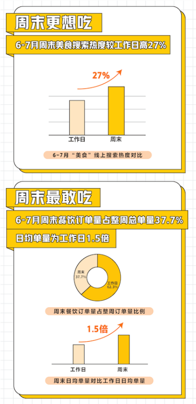 據(jù)美團(tuán)點(diǎn)評(píng)餐飲學(xué)院發(fā)布的《2020周末餐飲堂食消費(fèi)趨勢(shì)洞察》顯示,疫情恢復(fù)期,餐飲堂食消費(fèi)活力回歸,周末餐飲消費(fèi)對(duì)整個(gè)餐飲市場(chǎng)復(fù)蘇助力明顯。美團(tuán)6-7月線上美食搜索熱度中,周末的搜索熱度較工作日高出27%;周末餐飲線上訂單量占整周總單量的37.7%,日均單量為工作日的1.5倍。周末餐飲消費(fèi)拉動(dòng)經(jīng)濟(jì)復(fù)蘇,正在成為驅(qū)動(dòng)消費(fèi)的新引擎。