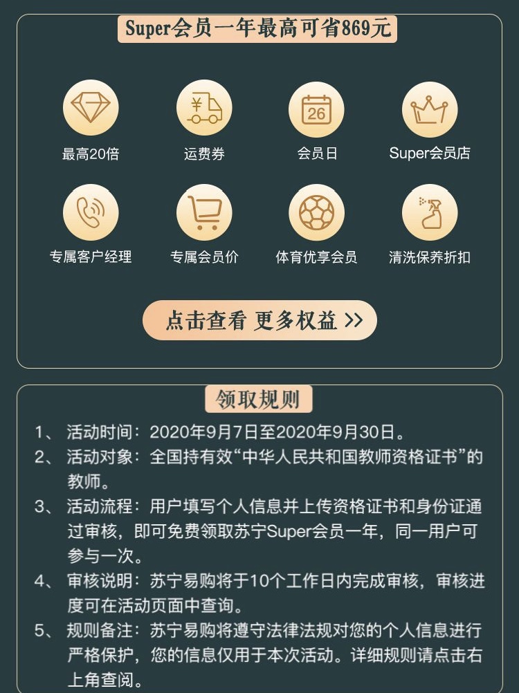 9月7至9月30日,凡持有效“中華人民共和國(guó)教師資格證書”的老師,在蘇寧易購(gòu)AP P上搜索“教師”,進(jìn)入 Super會(huì)員領(lǐng)取頁(yè)面,填寫個(gè)人信息并上傳資格證書和身份證。通過(guò)審核后,即可免費(fèi)領(lǐng)取蘇寧Super會(huì)員年卡一張。