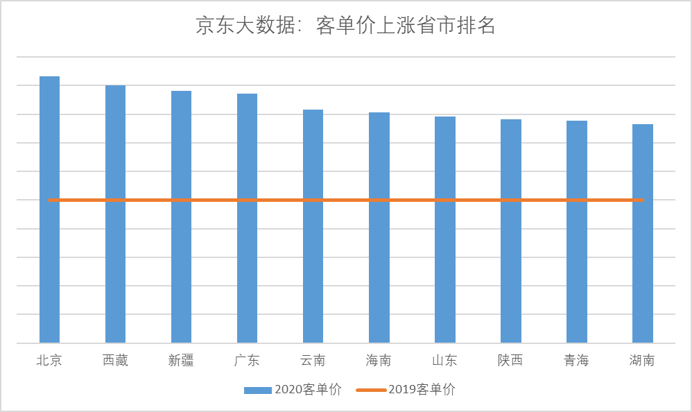 但是,消費(fèi)者采購月餅時(shí)卻呈現(xiàn)出更積極的上升趨勢(shì):據(jù)京東大數(shù)據(jù),今年京東平臺(tái)上不但用戶數(shù)大幅增加,其中相當(dāng)大部分新用戶來自低線市場(chǎng)用戶,而且消費(fèi)者相比去年更加追求品質(zhì),大品牌、高規(guī)格的月餅禮盒熱銷,因此月餅平均客單價(jià)比去年上漲了35%以上。下圖可見,除北京廣東等發(fā)達(dá)地區(qū)外,客單價(jià)上漲的主要?jiǎng)恿碜杂谖鞅?、西南和華中等地區(qū)。