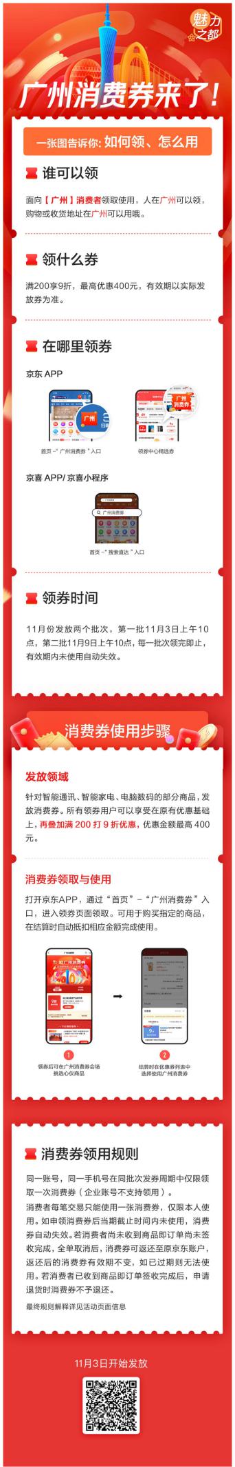 廣州消費券將發(fā)放兩個批次,第一批于11月3日上午10點發(fā)放,第二批于11月9日上午10點發(fā)放,領(lǐng)完即止。廣州消費券針對手機通訊、智能家電、電腦數(shù)碼等領(lǐng)域的熱銷產(chǎn)品,有效期6天。