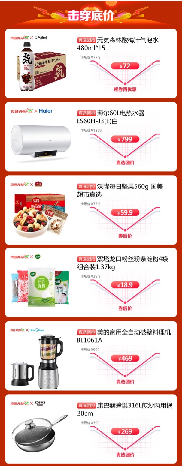 參與真選萬(wàn)人團(tuán)的產(chǎn)品,大家電如海爾電熱水器,市場(chǎng)價(jià)1599元,真選團(tuán)購(gòu)價(jià)低至799元;美的滾筒洗衣機(jī),市場(chǎng)價(jià)3599元,真選團(tuán)購(gòu)價(jià)2499元……優(yōu)惠力度非常之大,部分產(chǎn)品優(yōu)惠可超千元。