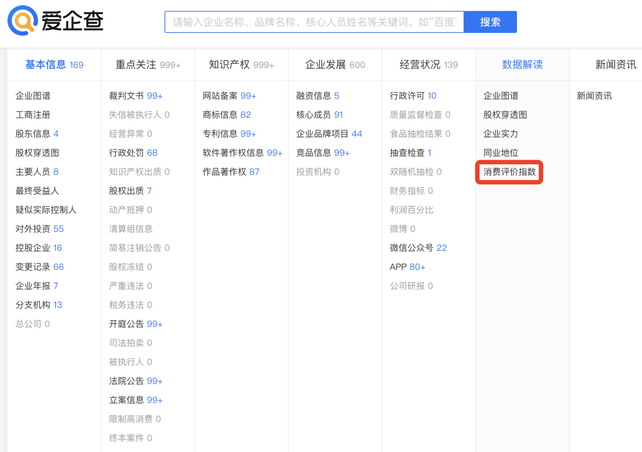 “愛企查”企業(yè)消費(fèi)評(píng)價(jià)指數(shù)查詢流程: