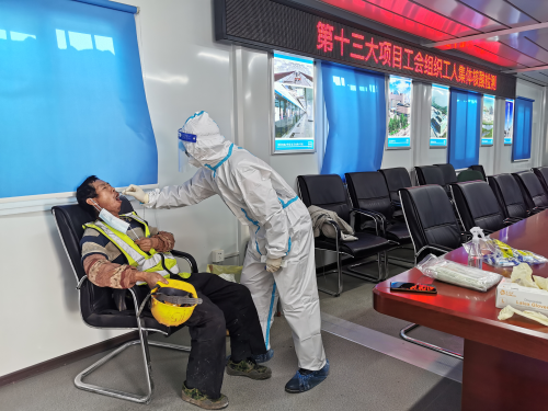 “項目部把核酸檢測的工作人員請到施工現(xiàn)場幫我們做采樣,既方便又安全,還不耽誤干活,真的太暖心了,防控疫情,排查隱患,我們也不能拖后腿?!爆F(xiàn)場工人說道。檢測前項目開展了測溫登記工作,確保每個工人檔案完整。檢測期間,在項目管理人員的組織下,工人們有序排隊、保持安全距離、領(lǐng)取檢測盒,工人在等候區(qū)戴好口罩,并間隔1米排隊。此次共計400余位勞務(wù)工人順利完成了核酸檢測。檢測過程中,項目部宣貫了防疫知識,提醒工友們在工作和生活上的防疫注意事項。