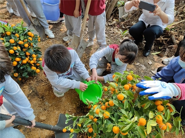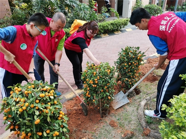 雍景城小區(qū)作為本次活動(dòng)的主會(huì)場(chǎng),現(xiàn)場(chǎng)熱鬧非凡。公明街道相關(guān)工作人員向光明區(qū)實(shí)驗(yàn)學(xué)校師生、志愿者、物業(yè)等講解年花年桔回植活動(dòng)的意義及安全事項(xiàng),并分成三組開始種植活動(dòng),大家你扶綠植我培土,你摘果桔我澆水,揮灑辛勤的汗水,很快,70多棵年桔就“立”起來了,枝干上掛滿了種植人員留下的真切的寄語。東明公寓、傳麒山小區(qū)的種植現(xiàn)場(chǎng)同樣溫馨而快樂。
