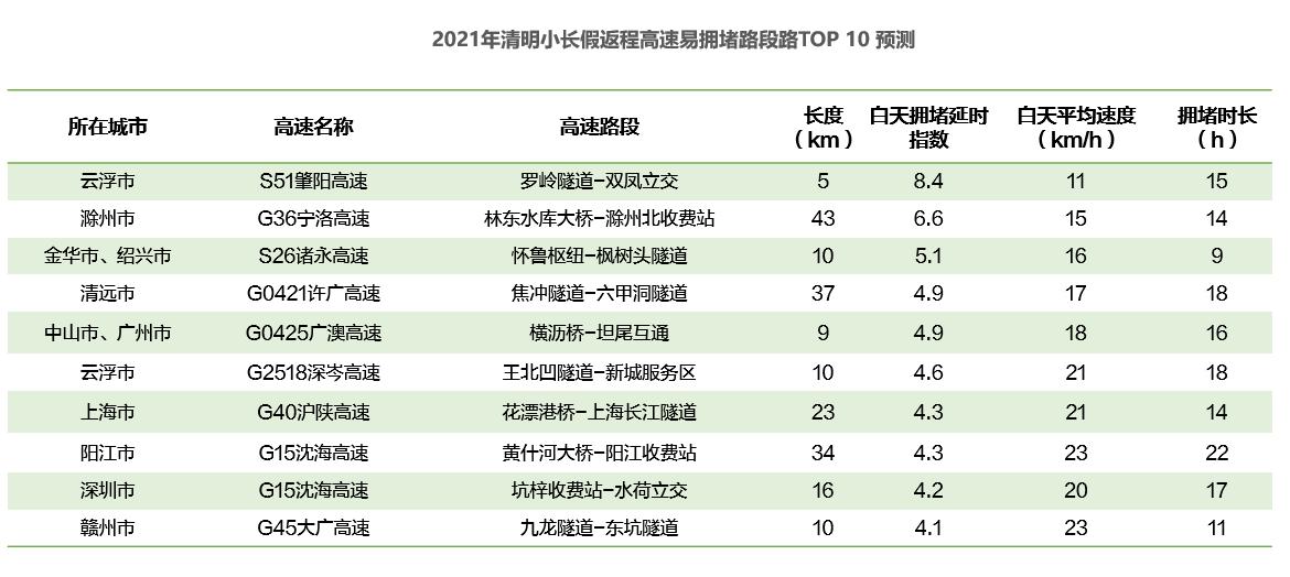 具體時(shí)段方面,預(yù)計(jì)2021年4月2日(清明小長假前一天)15時(shí)開始,全國高速交通壓力逐漸增大,20時(shí)至23時(shí)擁堵程度較高;4月3日(清明小長假第一天)8時(shí)至12時(shí)高速迎來出程擁堵高峰,預(yù)計(jì)10時(shí)至11時(shí)達(dá)峰值,4月5日(清明小長假最后一天)14時(shí)至19時(shí)為高速返程擁堵高峰。