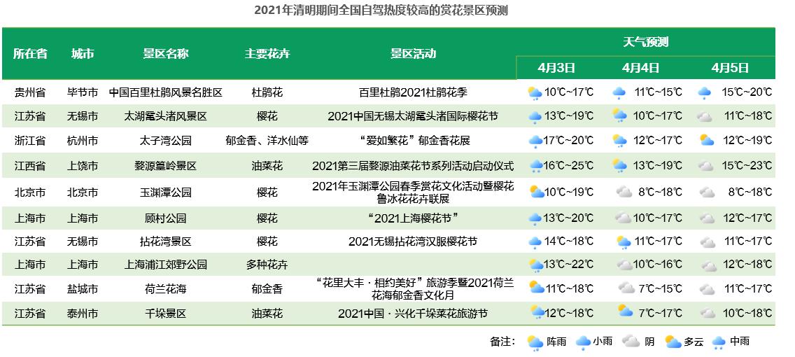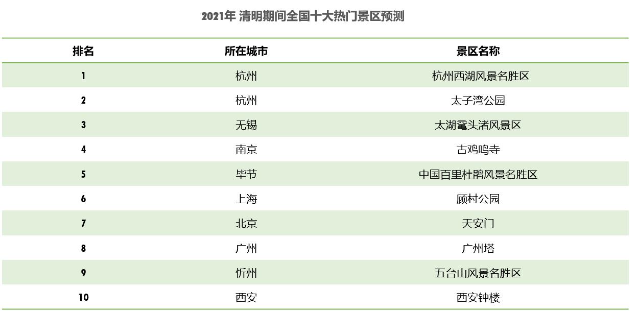 預(yù)計(jì)清明假期杭州西湖風(fēng)景名勝區(qū)最為熱門,其次為太子灣公園、太湖黿頭渚風(fēng)景區(qū)、古雞鳴寺、中國百里杜鵑風(fēng)景名勝區(qū)、顧村公園、天安門、廣州塔、五臺(tái)山風(fēng)景名勝區(qū)、西安鐘樓。