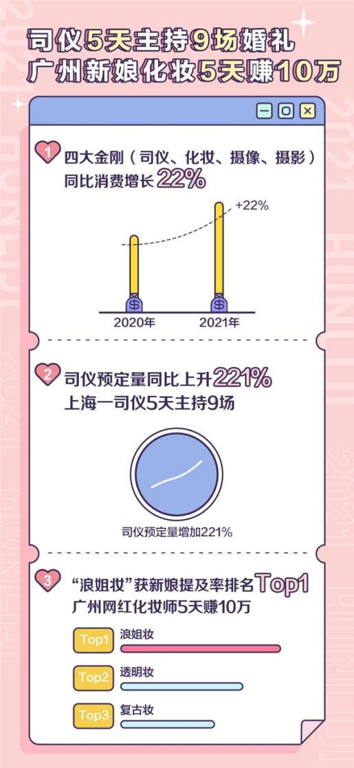 “快要忙瘋了,五一5天辦了150多場婚禮,第一天就有60場,去年這時候婚禮只有個位數(shù),今年我們員工都加班加點連夜趕工搭建場地?!被槎Y紀商家Sunny喜鋪婚禮副總趙佳佳在接受采訪的時候表示,不僅商家忙,新人也非常忙,Z世代的新人都習慣于通過線上咨詢、直播下單等互聯(lián)網(wǎng)形式進行婚禮消費,省去了線下奔波的時間。