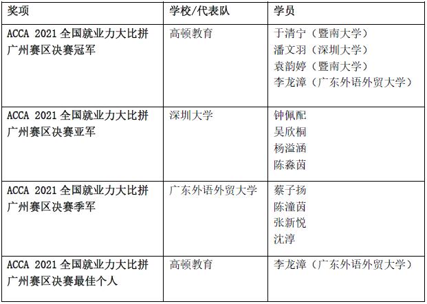 經(jīng)過4小時的激烈角逐,在評委的嚴(yán)格評選下,來自高頓教育、深圳大學(xué)和廣東外語外貿(mào)大學(xué)代表隊(duì)的同學(xué)獲得本次區(qū)域決賽的冠、亞、季軍。其中,冠、亞軍隊(duì)伍將于7月16日,代表廣州賽區(qū)出戰(zhàn)ACCA2021全國就業(yè)力大比拼總決賽,與國內(nèi)其他區(qū)域的優(yōu)秀隊(duì)伍同臺競技。