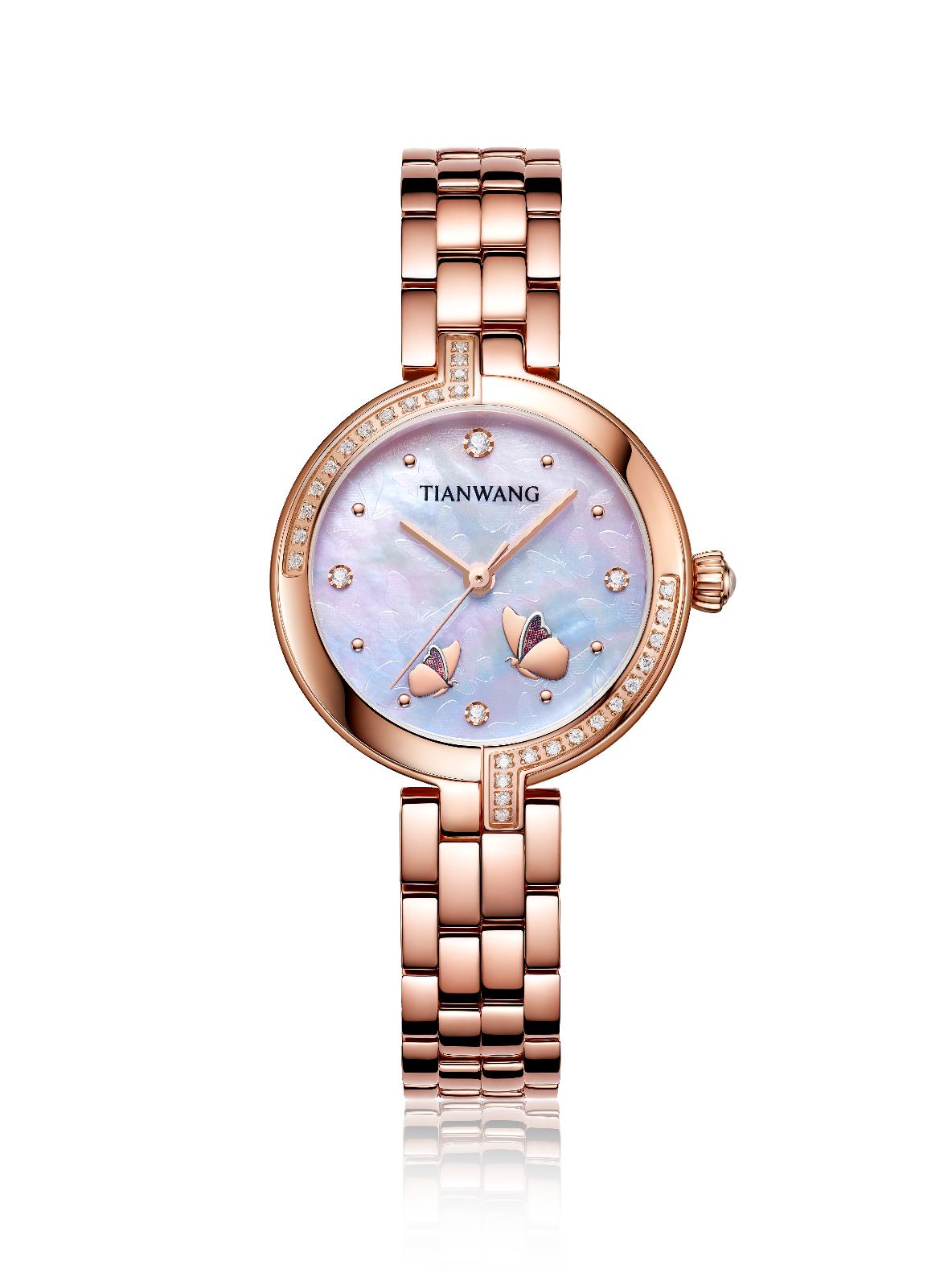 這次合作的腕表,沿襲了天王表的精品品質(zhì)和設(shè)計美學,有點“小確幸”的風格,整體很秀氣但是細節(jié)都誠意滿滿。表是蝴蝶的天空,指針是蝴蝶的舞步。表盤采用蝴蝶壓印貝母,在藍寶石玻璃表鏡下,兩只立體蝴蝶翩然起舞,人如蝴蝶,蝴蝶像人,都迷戀這花花世界,想要縱情暢游其中。腕表刻度和表圈由璀璨皓石點綴,3點、6點、9點、12點使用較大皓石,使得整個表盤錯落有致,富有層次感。搭配夢幻南瓜把的,極具浪漫色彩。玫瑰金色不銹鋼表殼,給人以優(yōu)雅炫目之感,質(zhì)感鋼帶,光澤度明亮,搭配不銹鋼蝴蝶扣,錦上添花,佩戴效果自然舒適。