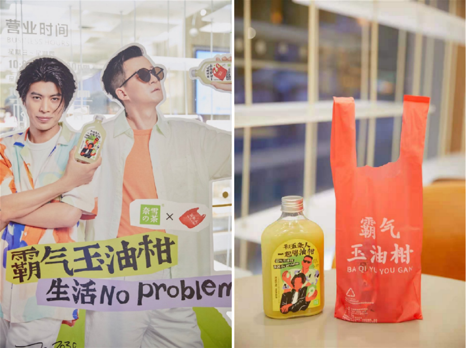 對(duì)于品牌×明星的聯(lián)名來說,調(diào)性契合是聯(lián)名活動(dòng)不可或缺的"出圈基因"。而奈雪的茶霸氣玉油柑與樂隊(duì)五條人,看似來自不同次元,實(shí)則都有大膽、堅(jiān)持、向上、樂觀的底色,而非將不搭嘎的兩個(gè)品牌生硬地“拉郎配”。奈雪還圍繞聯(lián)名別出心裁地推出了五條人主題的立牌、貼紙和堆頭,甚至將五條人標(biāo)志性的“紅色塑料袋”做成了極具個(gè)性且生物可降解的奈雪打包袋,可謂細(xì)節(jié)之處見真章。