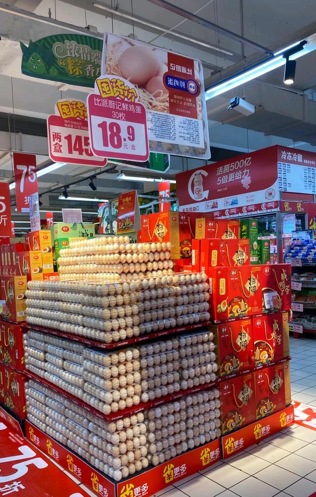 記者在走訪(fǎng)家樂(lè)福發(fā)現(xiàn),各大品牌的咸鴨蛋禮盒、粽子禮盒都已經(jīng)陸續(xù)上市。在咸鴨蛋禮盒中,神丹20枚皮蛋贅婿聯(lián)名款和神丹18枚青殼咸鴨蛋兩款禮盒都備受歡迎。