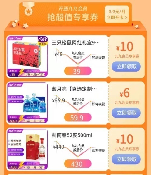 活動期間,九九會員可搶專享大額券,大牌網(wǎng)紅爆品狂歡底價。三只松鼠網(wǎng)紅堅果禮盒998g*2券后價39元,藍(lán)月亮洗衣液禮包券后價59.9元,劍南春52度500ml酒券后價430元......實實在在讓用戶買到“真低價”,買的“真值得”!
