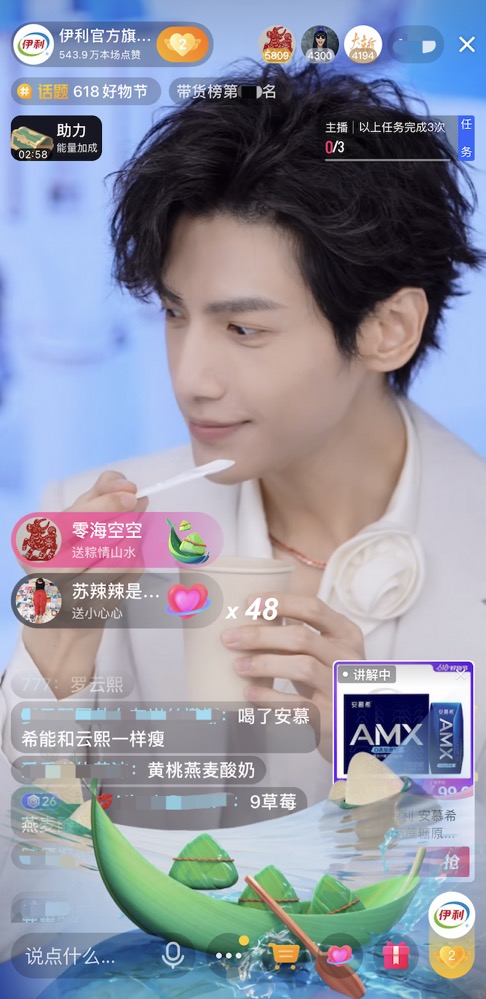 在新營銷上,伊利旗下安慕希品牌憑借強大的品牌力,在618期間聯(lián)合平臺打造首個乳品品牌狂歡日。邀請品牌形象大使羅云熙空降伊利抖音直播間,與消費者進行互動直播,內(nèi)容寵粉的同時高效轉(zhuǎn)化銷售。憑借寵粉互動吸引抖音平臺年輕消費者群體,狂歡日當(dāng)日直播間消費者中,年輕人群比例高達70%。