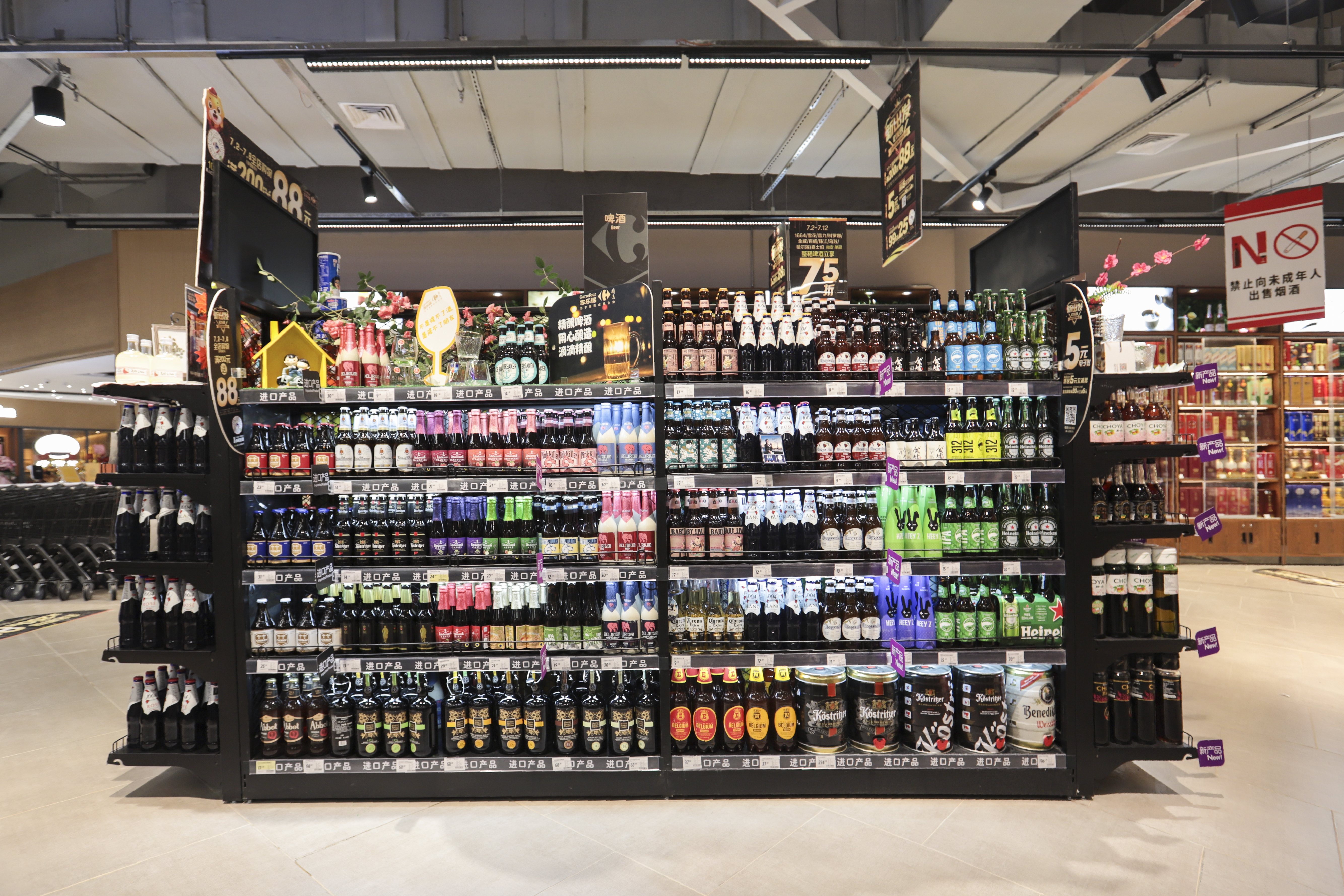 “福·飲品館”特色酒飲/沖調(diào)區(qū),酒水區(qū)域有豐富的種類,包括除了茅臺,白酒有大家熟知的五糧液、劍南春、習(xí)酒共128個單品,老酒新貴、高端洋酒、自飲送禮宴客各種場合的價位選擇都有,可謂是CBD里品類齊全的買酒首選場所,198萬的茅臺酒王單品亮相酒水區(qū)專柜更是為飲品館增添一抹亮色。