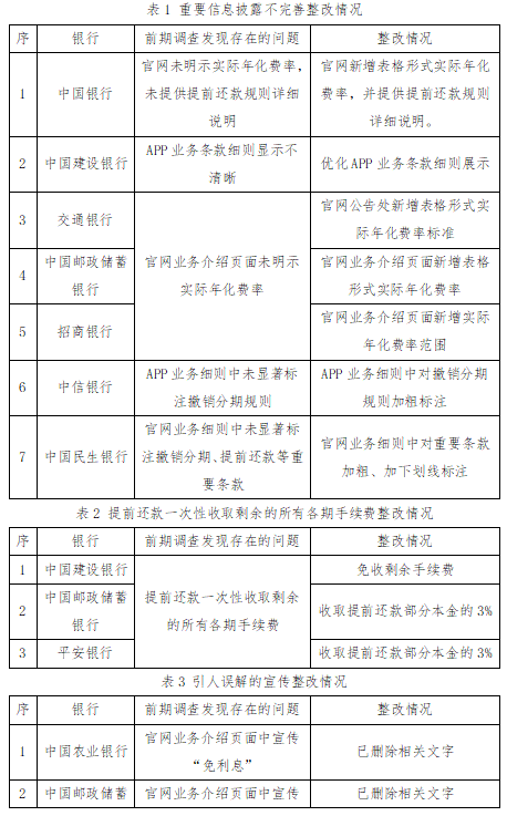中國銀行、交通銀行、中國郵政儲蓄銀行、招商銀行等銀行完善了官網(wǎng)信用卡分期業(yè)務(wù)實際年化費率的披露; 中國銀行、中國建設(shè)銀行、中信銀行、中國民生銀行等銀行完善了撤銷分期、提前還款規(guī)則等重要信息的披露;中國建設(shè)銀行、中國郵政儲蓄銀行、平安銀行針對消費者提前還款,由原先一次性須收取剩余所有各期手續(xù)費,修改為免收剩余手續(xù)費或僅收取一定比例違約金;中國農(nóng)業(yè)銀行、中國郵政儲蓄銀行、中國民生銀行刪除了“免利息”“手續(xù)費比例不隨分期期數(shù)的增長而提高”等容易引起消費者誤解的宣傳語。各銀行存在問題及整改情況如下: