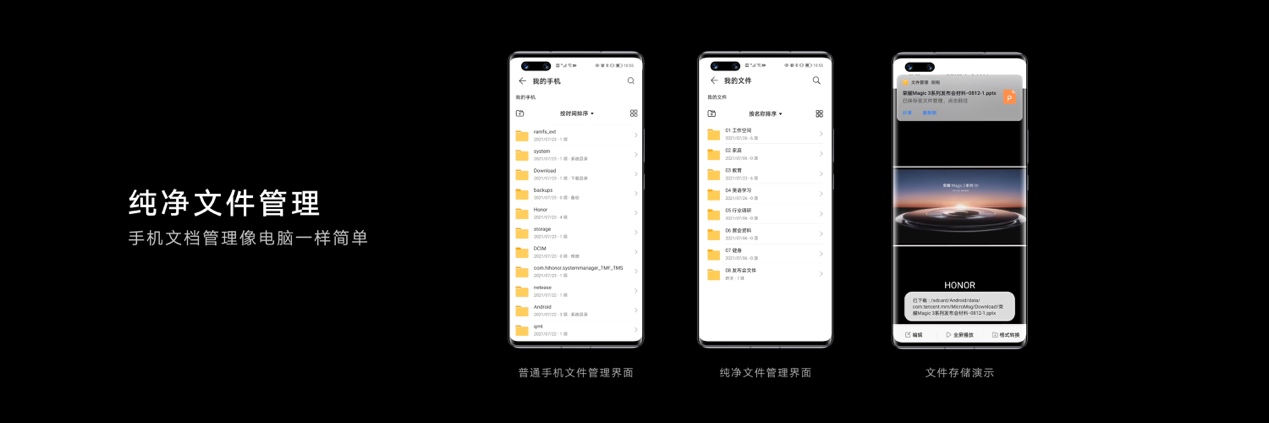 為了幫助事務(wù)繁多的商務(wù)人士更高效管理個(gè)人事務(wù),榮耀還與各辦公平臺(tái)合作,讓用戶在釘釘、飛書、Welink、WPS辦公平臺(tái)的日程均能通過榮耀Magic3系列進(jìn)行統(tǒng)一管理。而新增的純凈文件管理系統(tǒng)(此功能后續(xù)通過 OTA升級(jí)支持),則使榮耀Magic3系列在文件保存和管理方面進(jìn)行進(jìn)一步簡(jiǎn)化,讓手機(jī)文件管理從此可以像電腦一樣簡(jiǎn)單便捷。