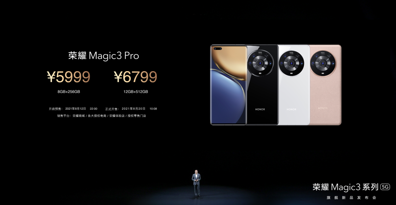 榮耀 M agic38GB+128GB版售價(jià)4599元,8GB+256GB版售價(jià)4999元;榮耀Magic3 Pro8GB+256GB版售價(jià)5999元,12GB+512GB版售價(jià)6799元;榮耀Magic3至臻版12GB+512GB售價(jià)7999元。8月12日22:00榮耀 Magic3系列手機(jī)正式開啟預(yù)售,8月20日10點(diǎn)08分,榮耀 M agic3系列手機(jī)將于榮耀商城、各大授權(quán)電商、榮耀體驗(yàn)店、榮耀零售門店等全平臺(tái)開售。