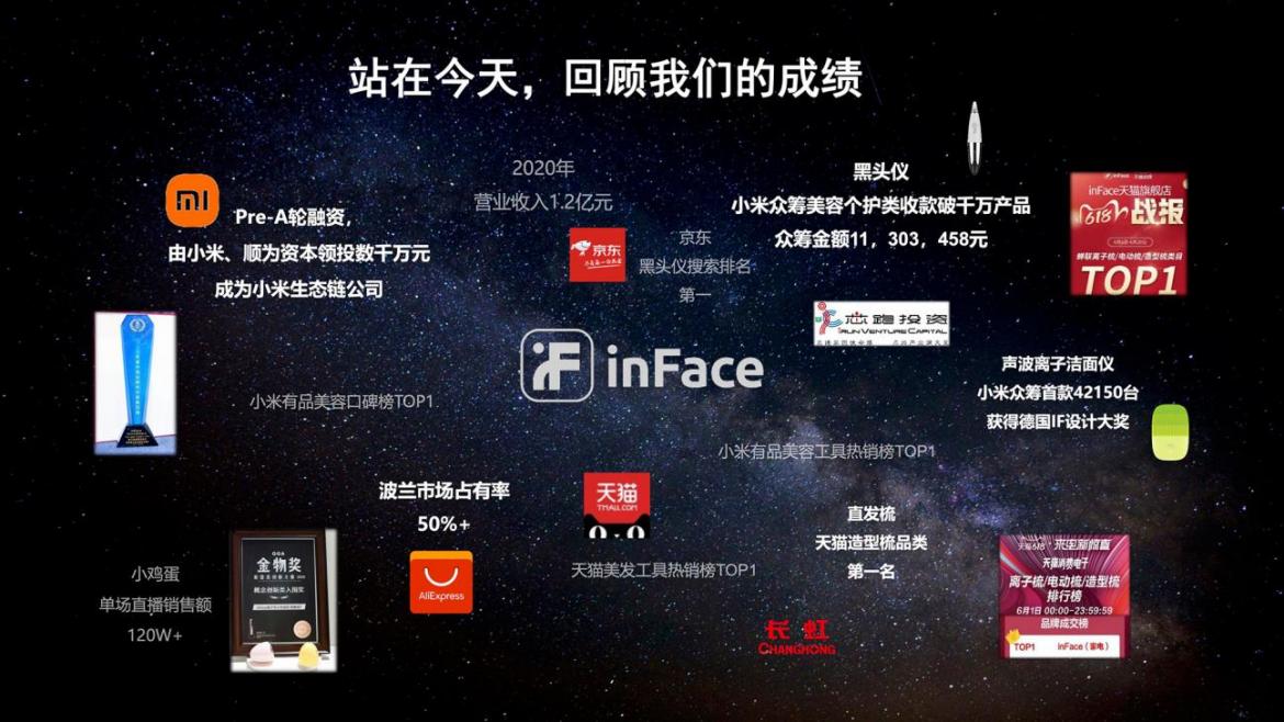 據(jù)了解, inFace創(chuàng)立于2017年6月21日,經(jīng)過近1年籌備,2018-2020年完成了第一個“三年計劃”,即實現(xiàn)成為行業(yè)有代表和開創(chuàng)性“產(chǎn)品型公司”的戰(zhàn)略目標。在這期間,inFace發(fā)布原創(chuàng)產(chǎn)品12款+,年營收超1億元,同時完成由小米集團、順為資本領(lǐng)投的數(shù)千萬元Pre-A輪融資,正式加入小米生態(tài)鏈。在小米有品、天貓和京東等國內(nèi)主流電商平臺上,核心類目例如潔面儀、黑頭儀、直發(fā)梳、美膚儀和美容儀等產(chǎn)品,inFace都是TOP級商家。