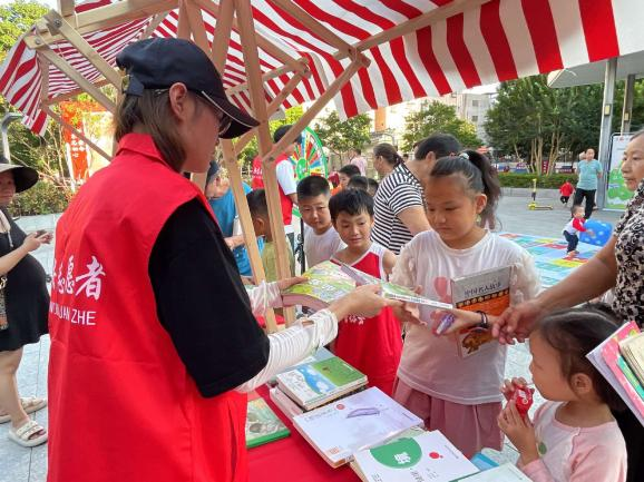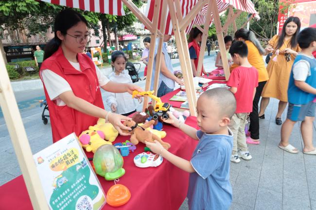 活動現(xiàn)場設有“換享游戲區(qū)”“換享市集區(qū)”“換享留影區(qū)”“換享觀影區(qū)”四大區(qū)域,吸引了200余名社區(qū)居民、志愿者、小朋友共同參與,發(fā)放《條例》手冊和宣傳資料250余份。