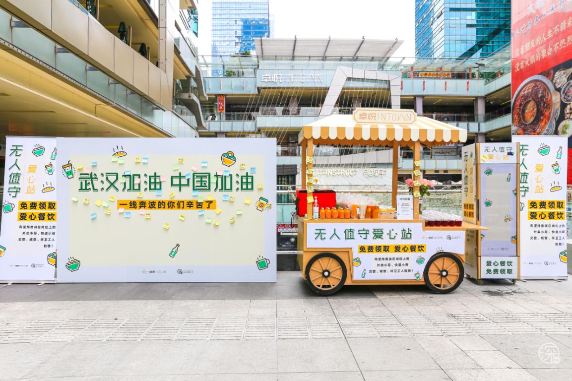 3月3日至3月8日卓悅INTOWN在街頭專設(shè)了一個(gè)”無人值守愛心站”,用愛心餐車上放滿了食物冷/熱飲,專門免費(fèi)贈(zèng)送給快遞、外賣小哥、環(huán)衛(wèi)工人、警察、城管等一線奔波的人員。