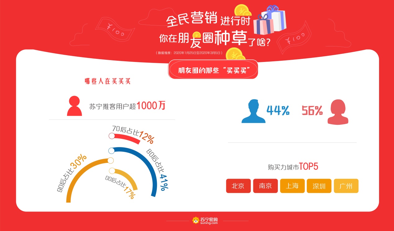 近日,蘇寧易購發(fā)布全民營銷大數(shù)據(jù),2020年1月25日至3月5日,蘇寧推客買家數(shù)和賣家數(shù)分別突破千萬、百萬大關(guān),80后成為朋友圈買、賣“雙主力”,糧油休食、個(gè)護(hù)家清、生鮮等產(chǎn)品成為最受歡迎的消費(fèi)品類。