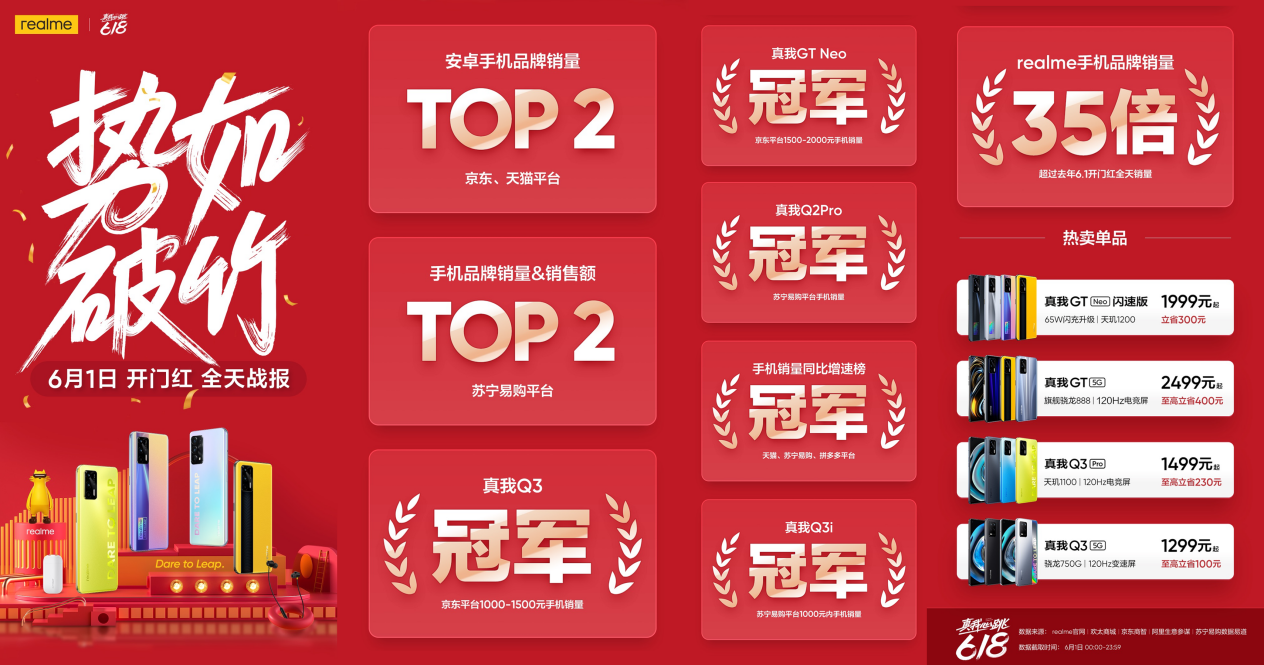 智能手機品牌realme真我公布618開門紅首日戰(zhàn)報:realme真我斬獲京東、天貓平臺安卓手機品牌銷量TOP2,蘇寧易購手機品牌銷量&銷售額TOP2,成為天貓、蘇寧易購、拼多多平臺手機銷量同比增速榜冠軍,手機品牌銷量超過去年開門紅全天銷量35倍,創(chuàng)下品牌618開門紅歷史最佳成績!