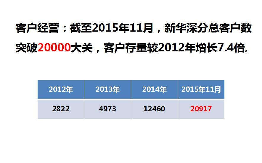 客戶經營:截至2015年11月,新華深分總客戶數突破20000大關,較2012年增長近7.4倍。