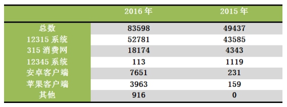 2016年,深圳市、區(qū)消委會(huì)共接受消費(fèi)者投訴83598宗,比2015年的49437宗增長(zhǎng)了69.10%,為消費(fèi)者挽回?fù)p失2.1億元。其中,52781宗來(lái)源于12315系統(tǒng),占63.13%;“315消費(fèi)通”的網(wǎng)頁(yè)端、手機(jī)端、微信端已經(jīng)成為另一消費(fèi)者投訴主渠道,全年共接收消費(fèi)者投訴30552宗,占36.55%,比去年的9.57%提高了27%。如表1所示。