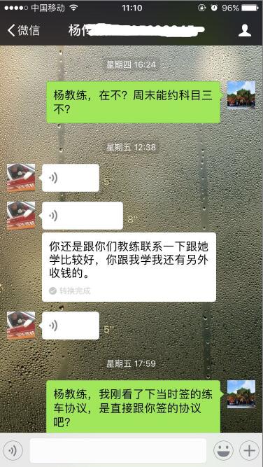 2017年8月,陳先生與寶華駕校教練員楊某銀簽《駕駛員培訓(xùn)合同》,并支付了全款培訓(xùn)費(fèi)用8000元(見(jiàn)微信截圖)。2018年1月,陳先生通過(guò)科目二考試后,與楊某預(yù)約科目三考試。楊某提出要再次收費(fèi)(詳見(jiàn)聊天記錄)。陳先生與楊某溝通無(wú)效后,向該教練掛靠的寶華駕校投訴維權(quán),寶華駕校反應(yīng)“其一,駕校不接收學(xué)員不與學(xué)員簽合同;其二,教練的投訴先調(diào)查了解”,后續(xù)再無(wú)反饋。