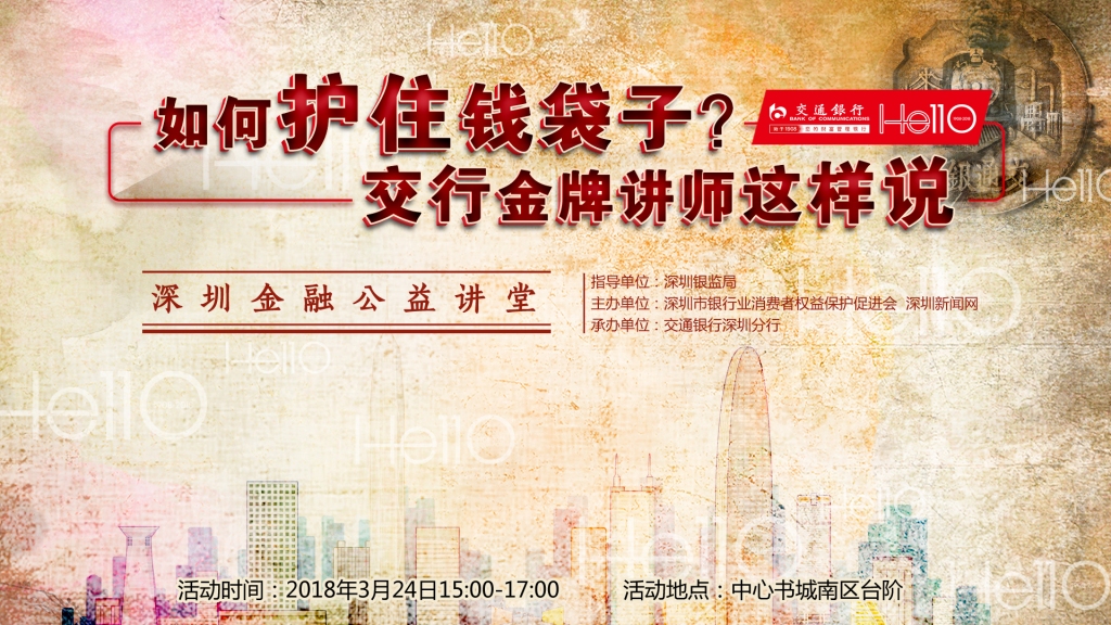在深圳銀監(jiān)局指導下,由深圳新聞網(wǎng)和深圳市銀行業(yè)消費者權益保護促進會共同主辦,交通銀行深圳分行承辦的2018年“深圳金融公益講座”系列活動將在3月24日14:30,于中心書城南區(qū)大臺階拉開帷幕。