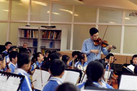 在王翔云成為丹堤實(shí)驗(yàn)學(xué)校的一員之后,就將自己投入到了弦樂團(tuán)的學(xué)生訓(xùn)練中,每天起早貪黑地和孩子們一起訓(xùn)練,甚至利用周末時(shí)間和孩子們待在一起練習(xí)。在和孩子共同努力下,丹堤實(shí)驗(yàn)學(xué)校的弦樂團(tuán)在2016年龍華新區(qū)學(xué)校藝術(shù)展演榮獲一等獎(jiǎng),在2016年廣東提琴文化藝術(shù)節(jié)青少年弦樂邀請(qǐng)賽中獲得銀獎(jiǎng)?!爱?dāng)然,這些成績(jī)的獲得也離不開學(xué)校的大力支持,離不開張國(guó)明教授等高人的指點(diǎn)。我認(rèn)為小學(xué)階段是人一生中形成德育和美育的重要時(shí)期。我們總會(huì)要求孩子們要形成良好的生活習(xí)慣,我認(rèn)為倒不如讓他們覺得我們現(xiàn)在做的每一件事都是正確的,有意義的,比如在我們的課堂和訓(xùn)練中,我就會(huì)要求他們將譜臺(tái)、椅子、琴盒、琴袋等擺放整齊,現(xiàn)在他們都可以自覺地完成?!?/p>