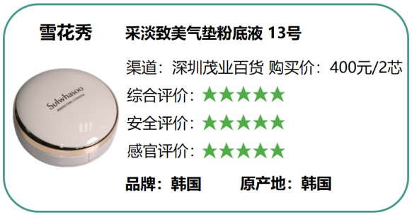 (二)綜合評(píng)價(jià)結(jié)果:獲五星卓越評(píng)價(jià)的2款,分別為姬芮和雪花秀;獲四星半優(yōu)秀評(píng)價(jià)的3款,分別為圣羅蘭、百雀羚和卡姿蘭;獲四星優(yōu)良評(píng)價(jià)的3款,分別為蘭蔻、蘭芝和自然堂;