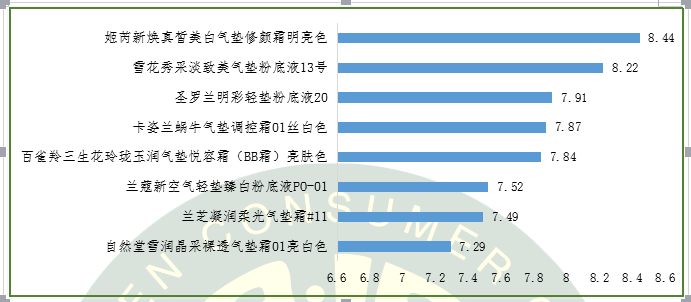獲得本次感官評(píng)價(jià)指標(biāo)綜合得分前三名的品牌為:姬芮、雪花秀和圣羅蘭,得分分別為:8.44、8.22和7.91。8款產(chǎn)品在感官評(píng)價(jià)中均達(dá)到優(yōu)良水平以上。