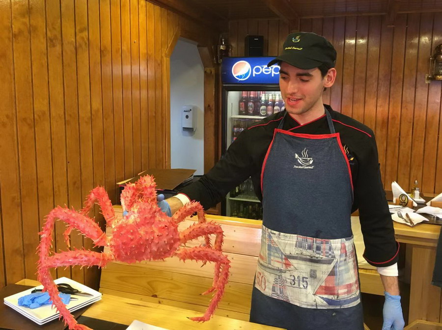 據(jù)介紹,蜘蛛蟹是用一種鐵籠子放入深海誘捕的,智利政府規(guī)定,小于1.5公斤的不許捕撈,因此,鐵籠的孔隙會放走幼小的蜘蛛蟹。李仁奇攝